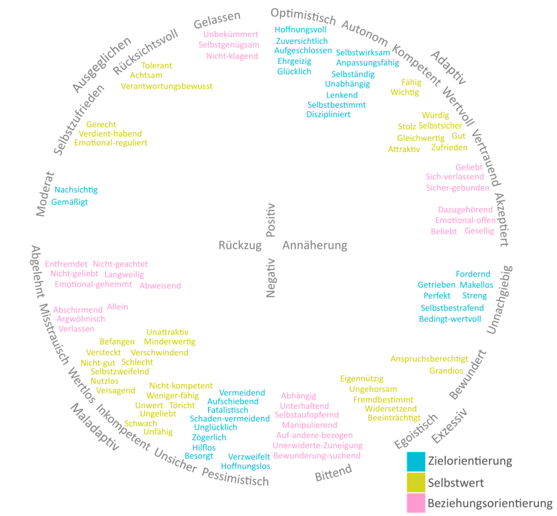 Abbildung 1 illustriert die Struktur in Form eines Circumplex-Modells. Nuancen (in farbiger Schrift) in räumlicher Nähe haben höhere Ähnlichkeit (das heißt sind positiv korreliert); Nuancen auf gegenüberliegenden Seiten sind gegensätzlich (das heißt negativ korreliert). Positive Glaubenssätze finden sich im oberen Bereich; negative im unteren. Auf horizontaler Ebene wird die Dimension Richtung abgetragen (Annäherung vs. Vermeidung). Die Domänen sind farblich kodiert. Die Quadranten sowie die Facetten sind in grauer Schrift am äußeren Rand des Modells abgetragen.